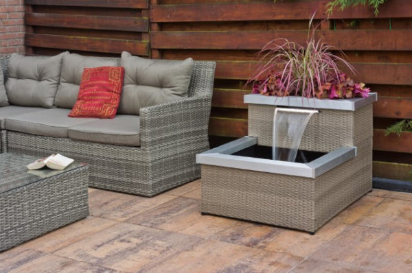 Kis kerti tavat varázsol a teraszra. Modern, 2 szintes terasz csobogó, led világítású integrált vízeséssel. Az oldalak fonott szürke és bézs műanyaggal bevonva, a felső élek dekoratív alumíniummal keretezve. A felső részben ki van képezve egy mélyedés, növény dekoráció számára. A csobogó belseje tófóliával bélelve. A set tartalmaz egy 4000 l/órás szivattyút is.