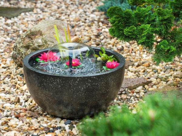 Elegáns mini tó, teraszra, balkonra vagy akár a nappaliba. 600 l/órás szivattyúval, és 3 db piros mű tavirózsával szállítva.