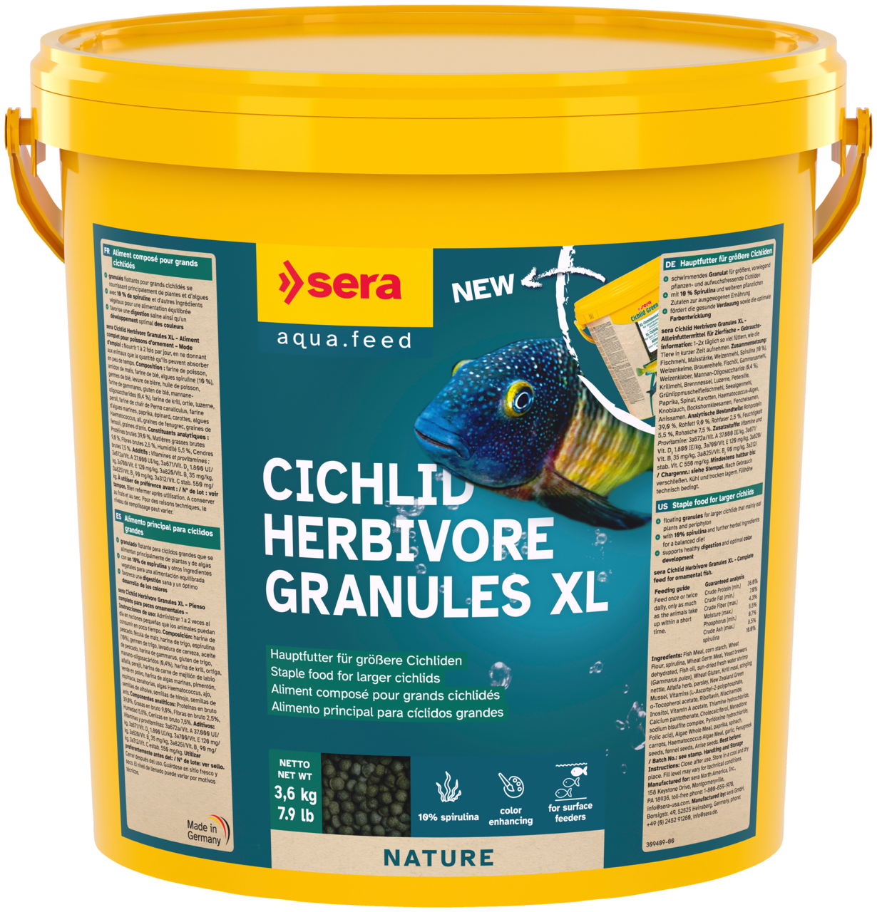A Cichlid Herbivore Granules XL egy fő eledel, amely kíméletesen feldolgozott granulátumokból készül, mesterséges színezékek és tartósítószerek nélkül. Különösen alkalmas nagyobb, túlnyomórészt növényekkel és algákkal táplálkozó sügérek és más nagy halak számára.