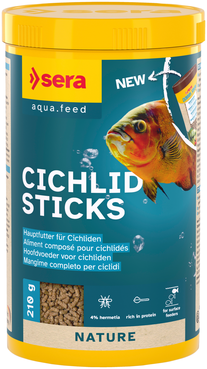 A sera Cichlids Sticks Nature különösen ízletes a fenntartható hal- és rovarlisztből származó, optimálisan emészthető fehérje magas mennyiségének, valamint az omega zsírsavaknak köszönhetően.