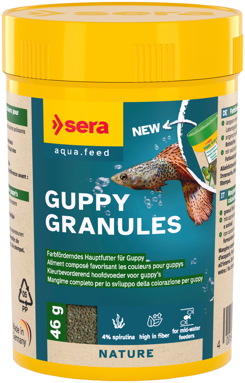 A sera Guppy Granules egy finoman előállított lágy granulátumból álló, színezékek és tartósítószerek nélkül készült vegetáriánus eledel minden olyan növényevő hal számára, amely főleg a víz középső rétegeiben táplálkozik, mint például a guppi.
