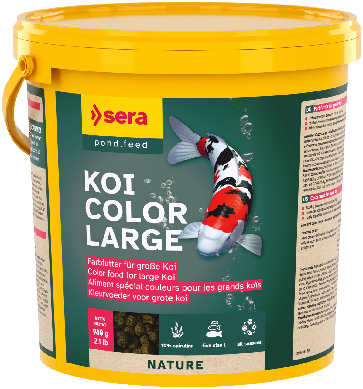 Teljesen táplált – a sera koi eledelével: A kis, közepes és nagy koi számára készült alapvető és színes eledelektől (Koi Royal & Color) a koi selyemhernyóhoz hasonló jutalomfalatokig és az energiában gazdag nyári eledelekig (Koi Pellets). Minden eledelváltozat mentes a mesterséges színezékektől és tartósítószerektől, ezért a sera „Nature” termékcsaládjának részét képezi. Azoknak a koi halaknak, amelyek extra vitaminadagot igényelnek (pl. stresszes vagy betegséges időszakokban), kifejezetten a Koi Vitamin Mix multivitamin koncentrátumot fejlesztették ki.