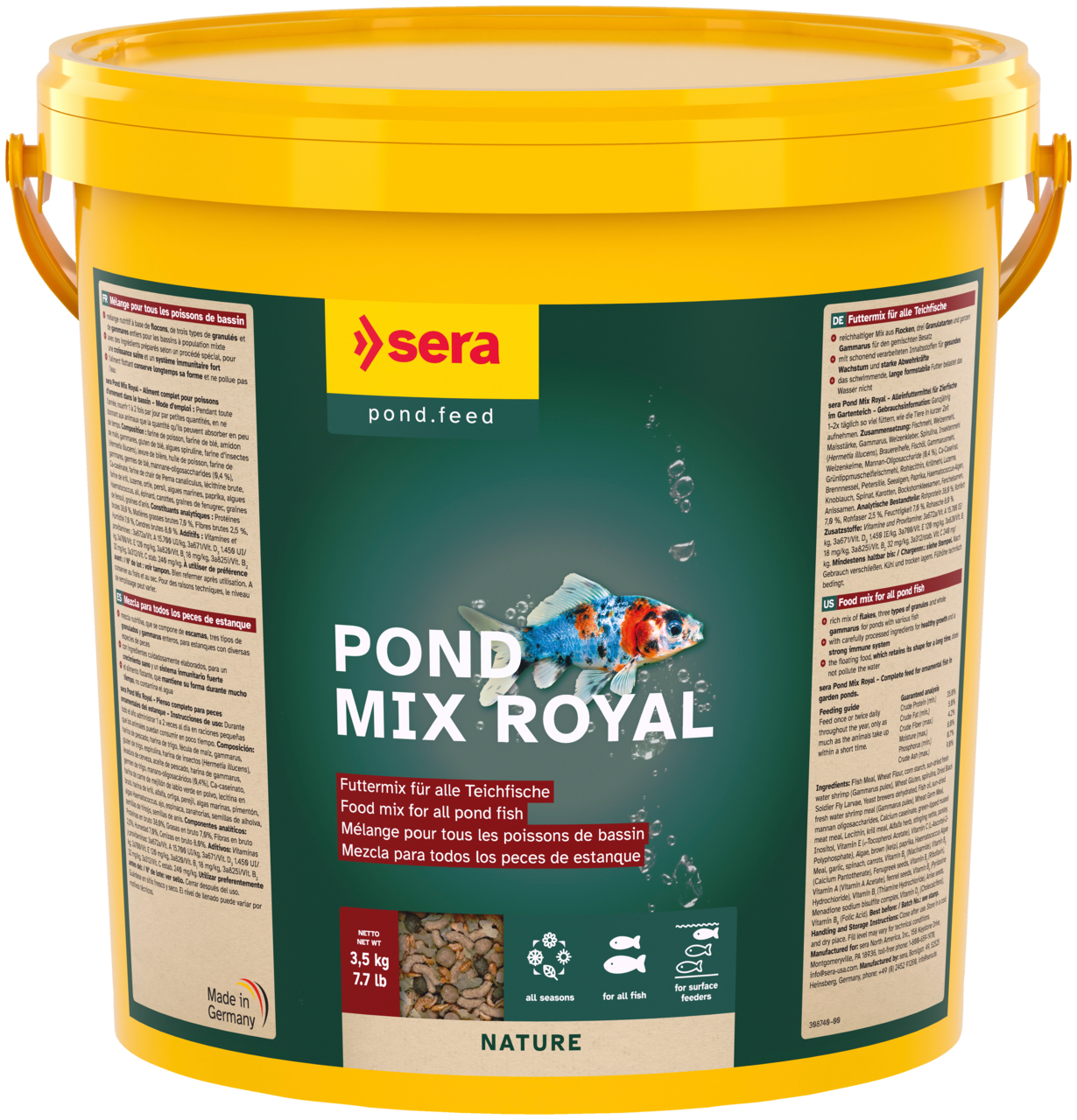 A Pond Mix Royal a kíméletesen feldolgozott pehelyből, granulátumból és egész gammarusból készült alapvető eleség vegyes halpopulációjú tavak egész éves etetéséhez. Természetesen mentes a mesterséges színezékektől és tartósítószerektől.